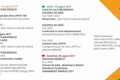 Miercuri, 16 august / Casa de Cultură Rădăuţi – Vernisajul expoziţiei „Dinu Lipatti 100” (ora 11.00); Masterclass – pian, vioară, muzică de cameră (orele 11.30-14.00);