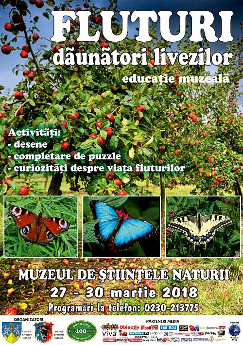 În perioada 27-30 martie 2018, la Muzeul de Ştiinţele Naturii din municipiul Suceava se va desfăşura lecţia muzeală Fluturi dăunători livezilor, susținută de biolog dr. Carmen- Florentina Oleniuc.