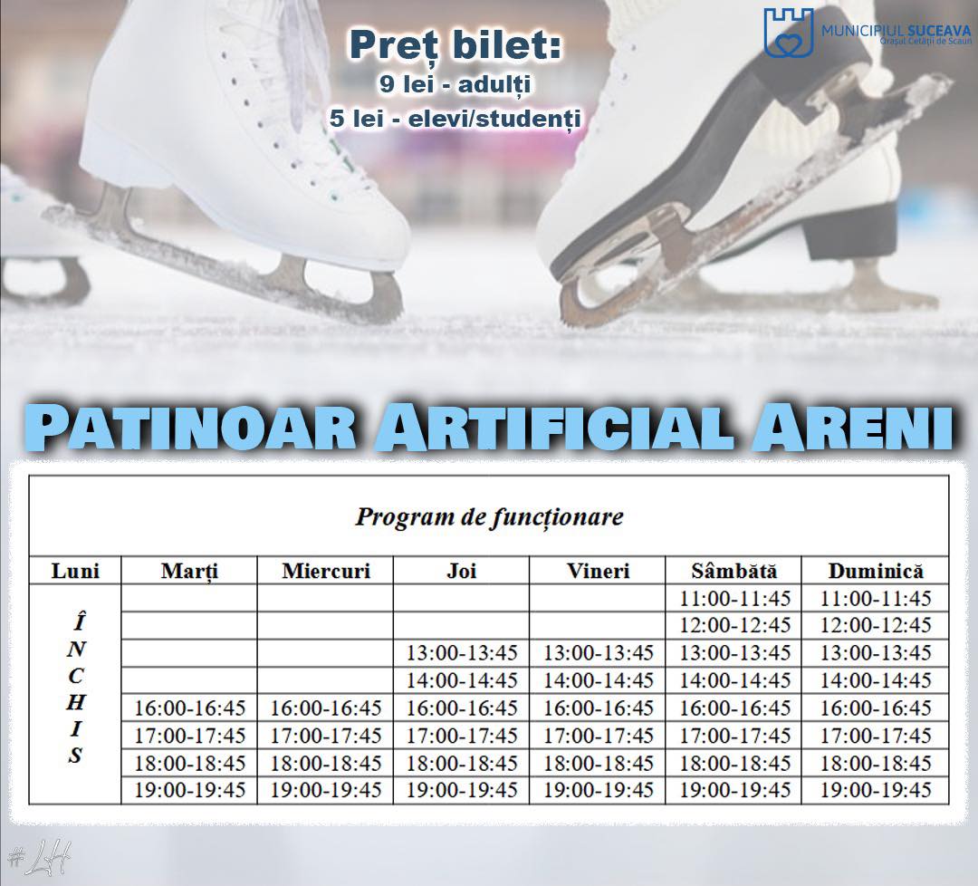 “Încă nu așezăm patinele în cui, vremea permite, iar sucevenii se pot bucura în continuare de Patinoarul Artificial Areni. De pe data de 1 decembrie și până astăzi, au fost încasați 81.887 lei, ceea ce dovedește că sucevenii rămân iubitori ai patinajului. Patinoarul rămâne deschis până pe 1 martie, așadar, distracție plăcută tuturor pe gheață!”.
