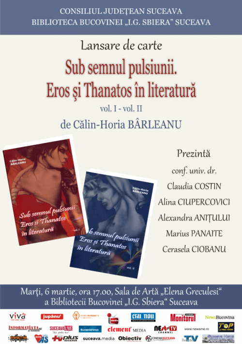 Marți, 6 martie, la ora 17.00, în Sala de Arta Elena Greculesi a Bibliotecii Bucovinei „I.G.Sbiera” din Suceava, va avea loc lansarea cercetării în două volume Sub semnul pulsiunii. Eros și Thanatos în literatură, semnată de Călin Horia Bârleanu și apărută la Editura Casa Cărții de Știință, Cluj.
