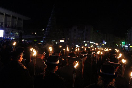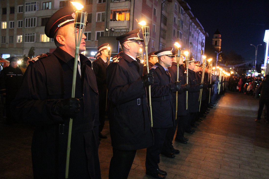 Parada cu torțe a reprezentanților ISU Suceava a fost un moment impresionat, urmărit cu mare plăcere de toți cei prezenți, care au făcut un culoar prin care să treacă zecile de reprezentanți ai forțelor de ordine. Retragerea cu torțe a fost urmată la scurt timp de aprinderea luminilor în bradul de Crăciun din Centru.