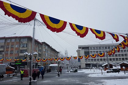Zona centrală a municipiului Suceava este împodobită, începând de ieri, cu sute de steaguri tricolore, cu formă semicirculară, amplasate atât pe suportul plasei de lumini de pe esplanadă, cât și pe Casa de Cultură.