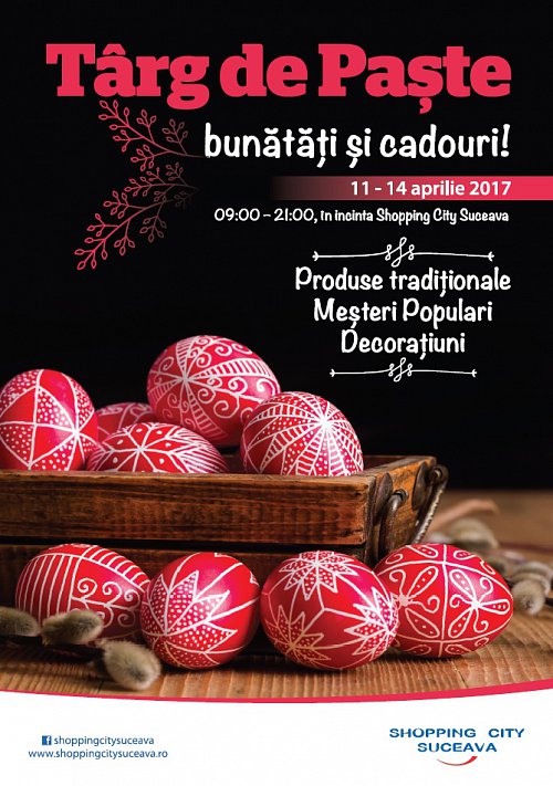 În perioada 11 - 14 aprilie, Shopping City Suceava, în parteneriat cu Centrul Cultural Bucovina și Centrul Județean de Conservare și Valorificare a Tradiției și Creației Populare Suceava se desfășoară o nouă ediție a cunoscutului eveniment – expoziție dedicat sărbătorilor pascale, “Târgul de Paşte”.